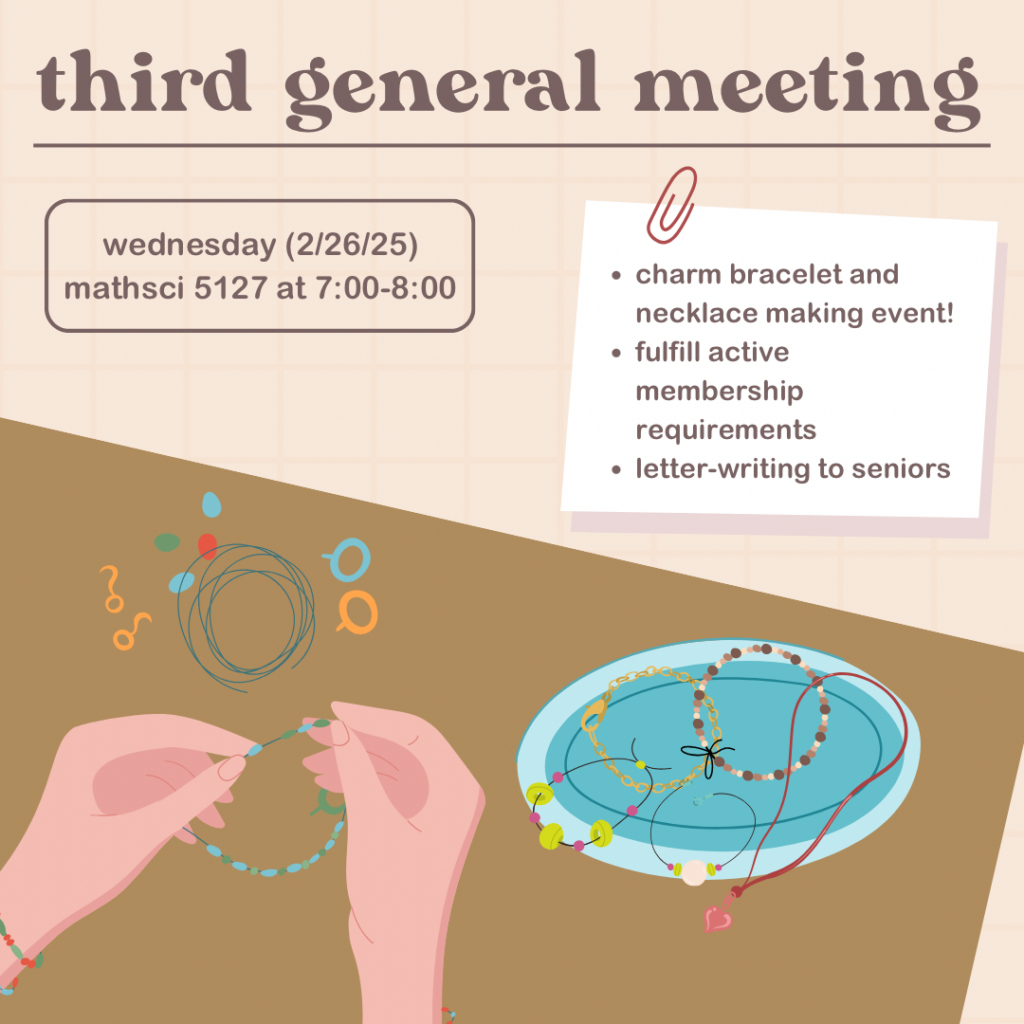 We are Quills to Connect and we wanted to extend our invitation to our charm bracelet and necklace making event! Get to know our members and learn about our club! We will be holding our third general meeting next Wednesday, February 26th from 7-8pm in the Mathematical Sciences Building Room 5127.