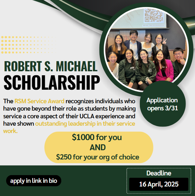 Apply for the Robert S. Michaels Leadership in Service Award! This scholarship recognizes individuals who have gone beyond their role as students by making service a core aspect of their UCLA experience and have shown outstanding leadership in their service work. Each recipient is awarded $1000 which will be distributed through the student’s BAR account over Fall, Winter, and Spring Quarters of 2025-2026. Additionally, each award recipient will select a UCLA service group that is a Registered Campus Organization, to receive the John H. Sarvey Service Award: an additional $250 to use during the 2025-2026 school year for organization-related purposes. To qualify for the award, you must be enrolled as a student during the 2025-2026 school year.