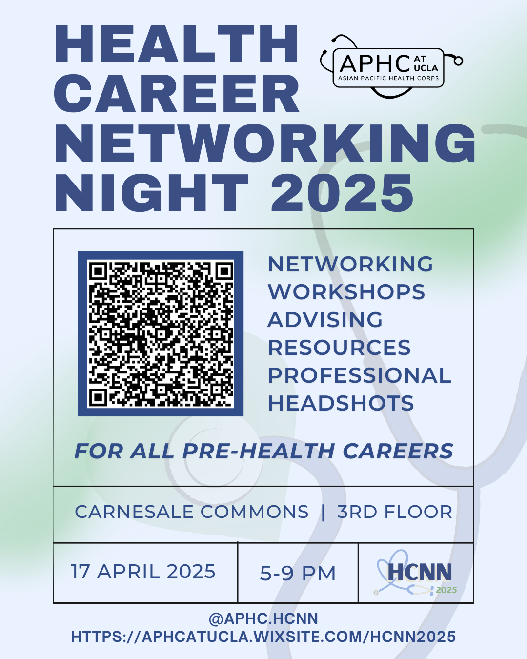 UCLA’s Asian Pacific Health Corps will be hosting its 14th Annual Health Career Networking Night on Thursday, April 17th from 5-9 PM PST on the 2nd and 3rd floor of Carnesale Commons. It is a chance for undergraduates to attend professional development workshops and network with over 50 health care professionals! We will have current physicians, dentists, pharmacists, pathologists, nurses, and more attending! If you are interested, please RSVP at this link and visit our website https://aphcatucla.wixsite.com/hcnn2025 for more information.